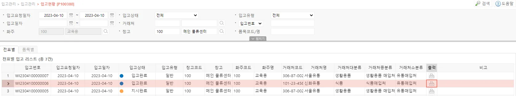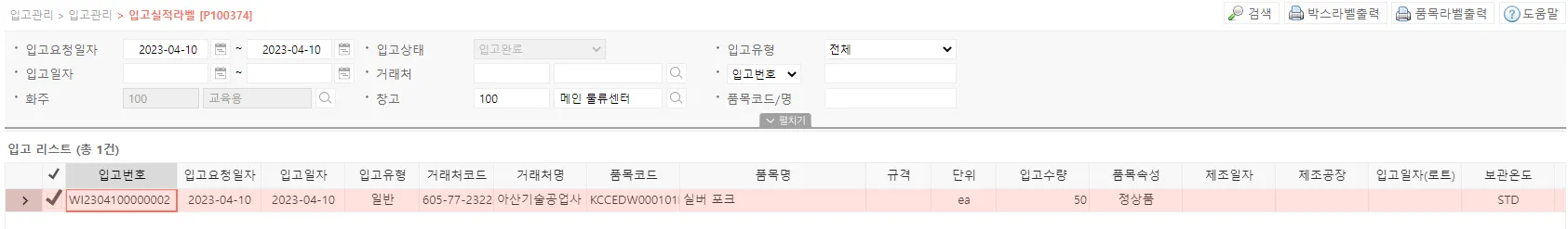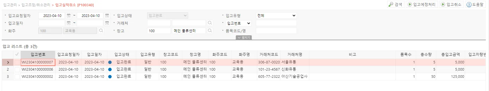 해당 조건에 맞는 입고 리스트가 화면에 출력됩니다.