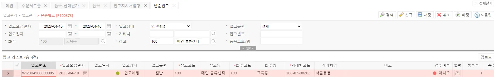 [1] 단순 입고 (입고관리 > 입고관리 > 단순입고)