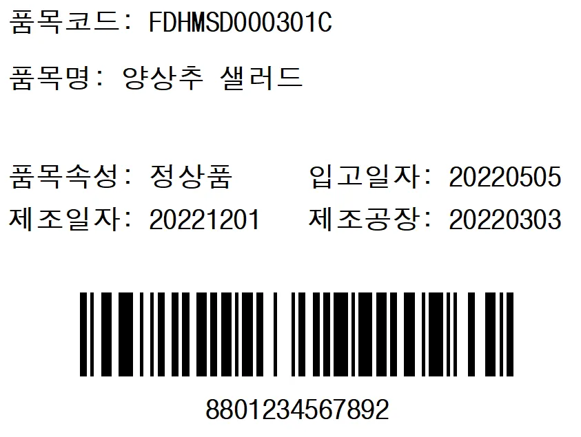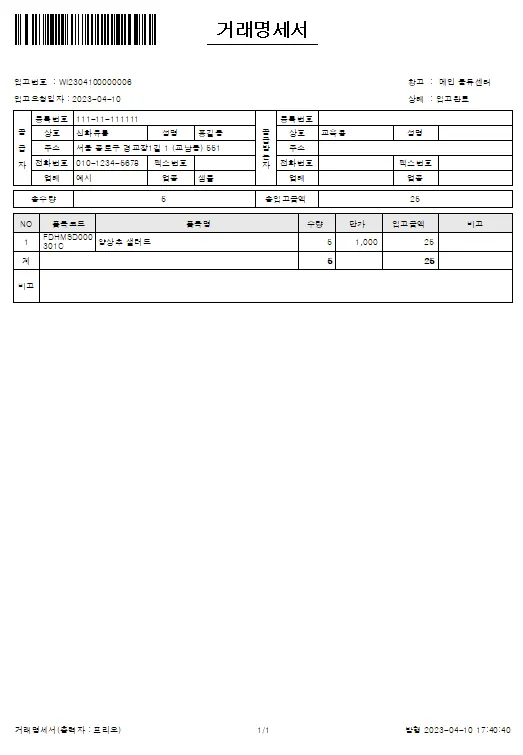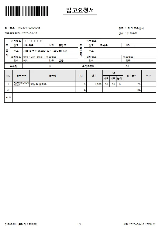 입고상품의 정보 및 입고시 입력된 정보를 함께 출력할 수 있습니다.