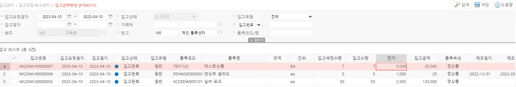 입고 금액 변경은 기 입고 완료된 내역의 입고 금액을 변경하는 기능입니다.