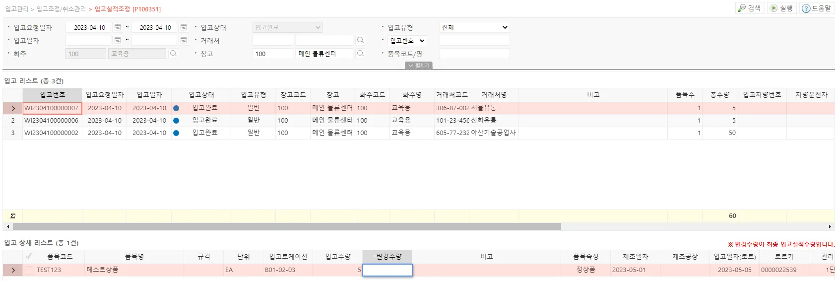 선택 후 하단 그리드에 출력된 입고 상세 내역 중 변경할 상품을 선택하고 수량을 입력합니다.