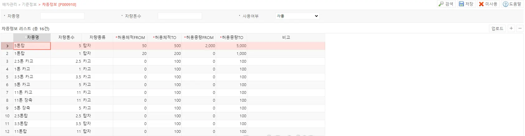 배차관리 > 기준정보 > 차종정보 [P000910]