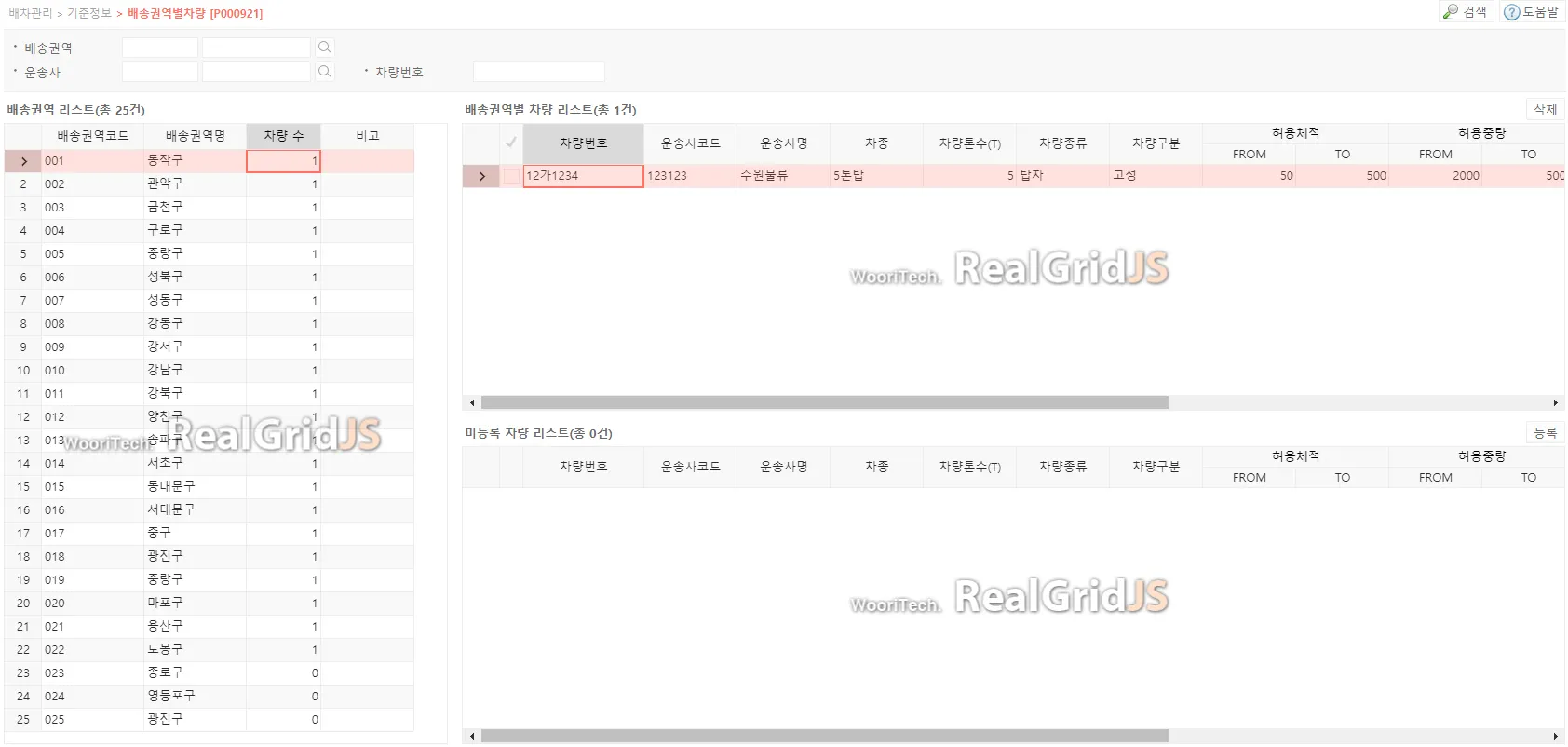 배차관리 > 기준정보 > 배송권역별차량 [P000921]