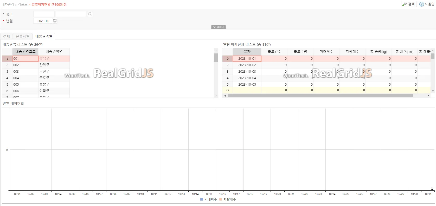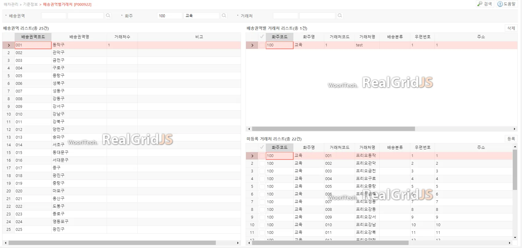 좌측 마스터 그리드에서는 배송권역의 리스트를 확인할 수 있으며, 권역 정보를 클릭시 우측 상단 그리드에서 해당 권역의 거래처를 확인 및 삭제할 수 있습니다.