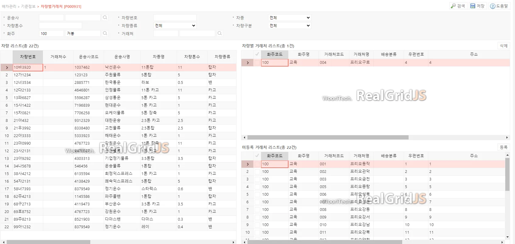 좌측 마스터 그리드에서는 차량의 리스트를 확인할 수 있으며, 차량의 정보를 클릭시 우측 상단 그리드에서 해당 차량의 거래처를 확인 및 삭제할 수 있습니다.