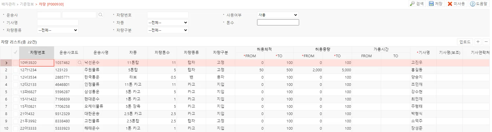 검색 : 특정 차량을 운송사, 차량번호, 기사명, 차량종류, 차종, 차량 구분, 톤수 등 다양한 조건으로 조회할 수 있습니다.