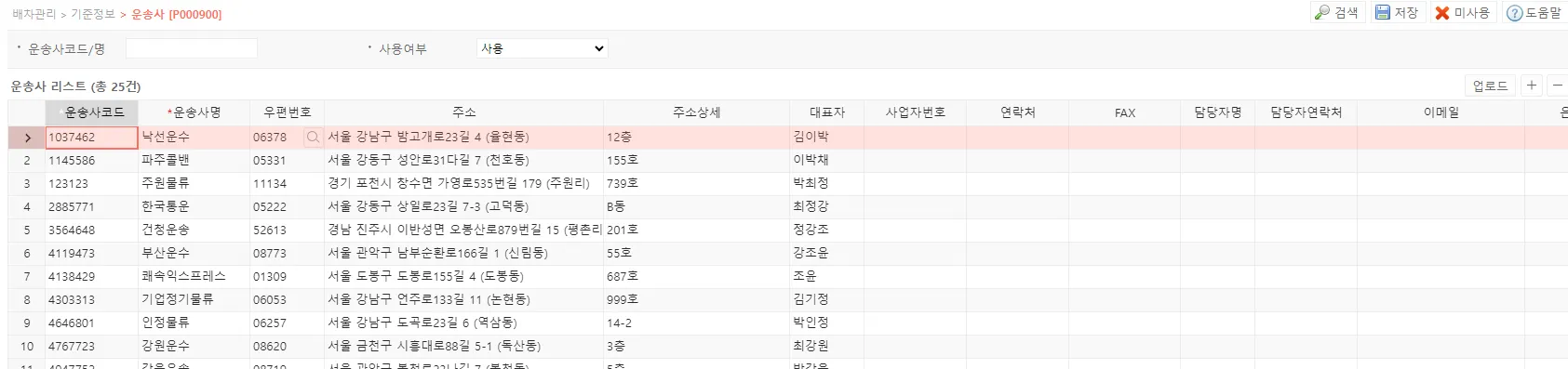 저장 : 운송사 정보를 등록하거나 수정한 뒤 저장합니다.