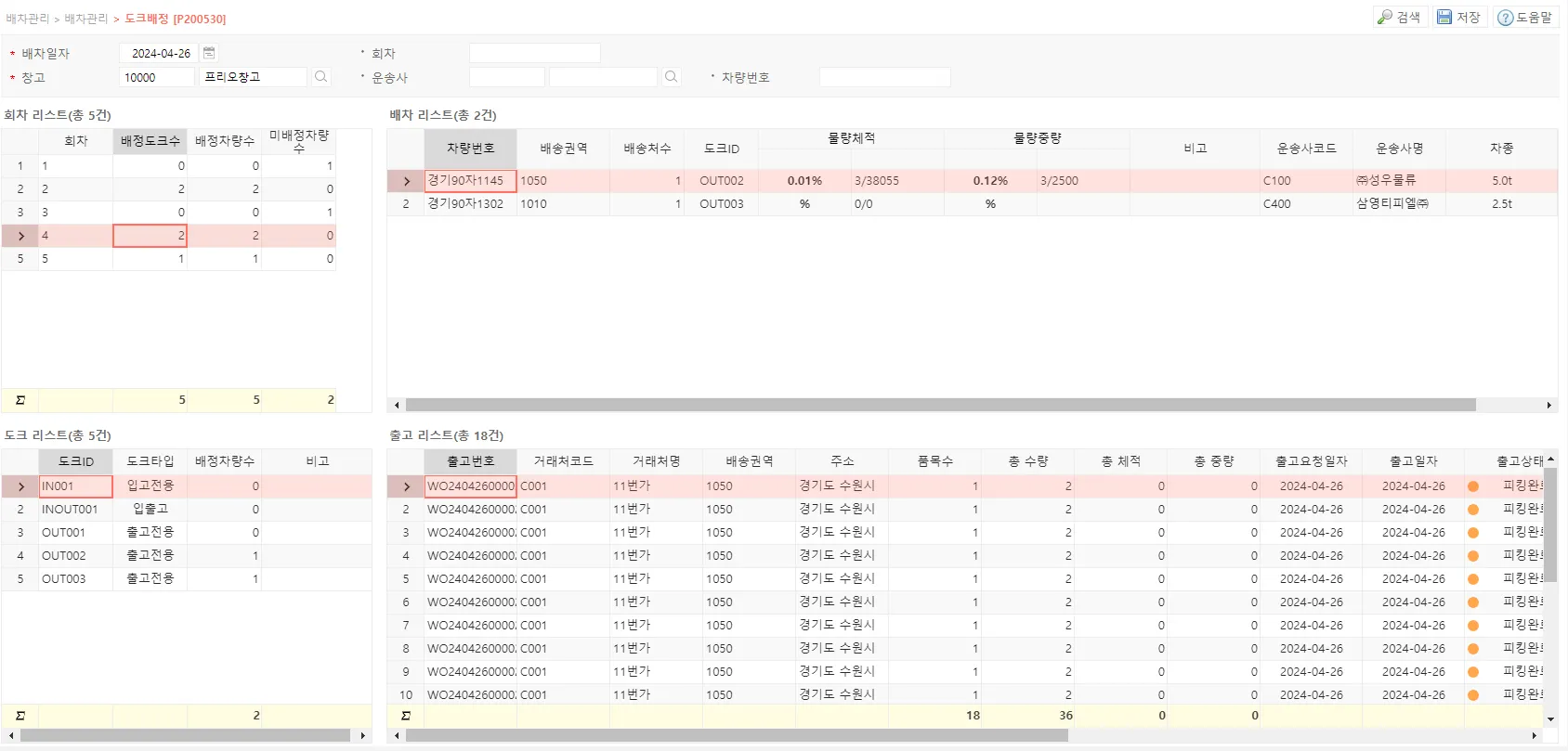배차관리 > 배차관리 > 도크배정 [P200530]
