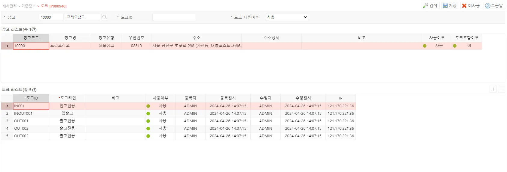 상단 마스터그리드에서 선택한 창고에 도크 리스트를 확인할 수 있으며, 도크 정보를 등록할 수 있습니다.