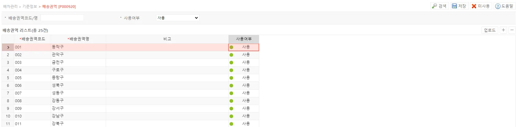 배차관리 > 기준정보 > 배송권역 [P000920]