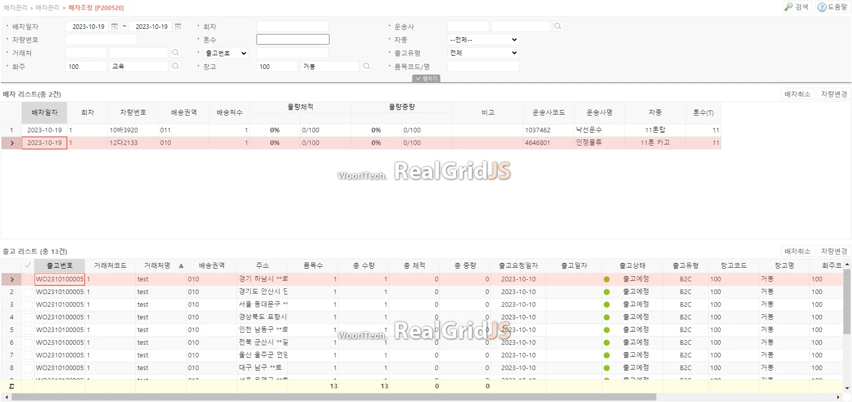 상단의 마스터그리드에서는 출고건의 상태 및 배차 관련 정보를 확인할 수 있습니다.