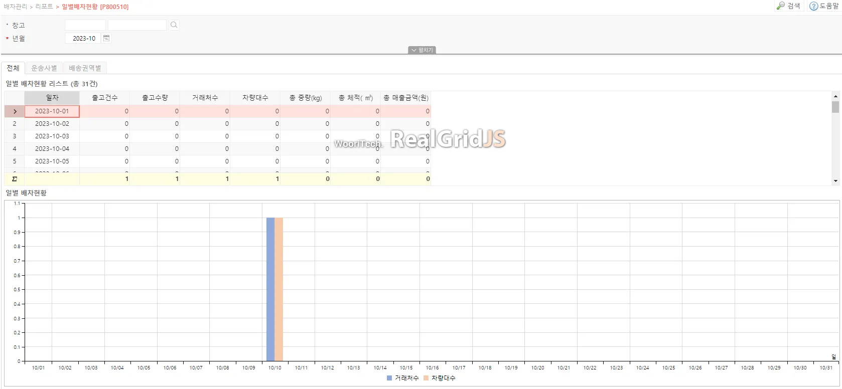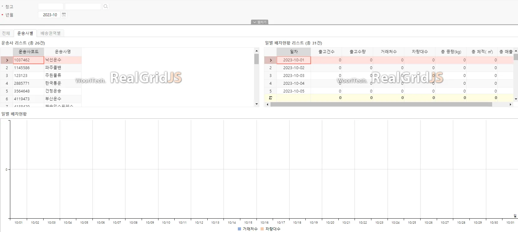 검색 : 출고 창고, 년월 기준으로 일별 배차 현황을 조회할 수 있습니다.