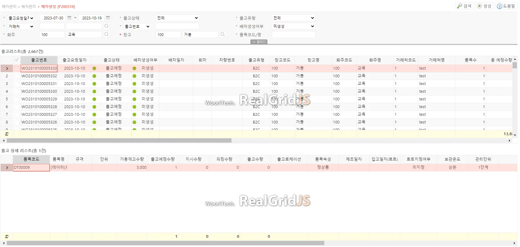 생성 : 마스터그리드 상단의 출고리스트에서 배차를 생성할 주문건을 선택 후 설정된 기준에 따라 배차를 생성합니다.