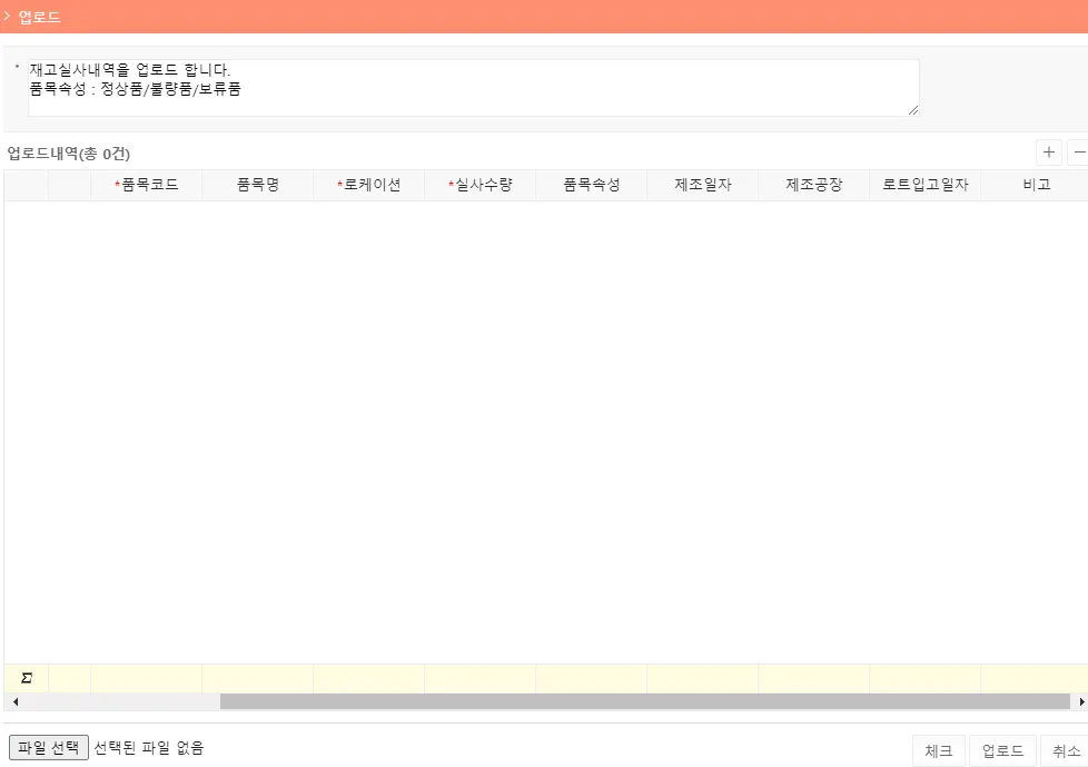 엑셀 업로드를 통해 품목코드, 로케이션과 실사수량을 입력하여 실사 내역에 대한 일괄 업로드를 처리할 수 있습니다. (아래 이미지 참고)