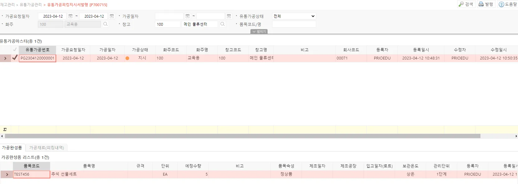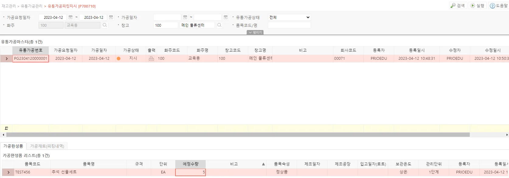 조회 버튼을 눌러 유통 가공등록이 완료된 내역을 확인 후 실행 버튼을 누르면 피킹 지시가 진행됩니다.