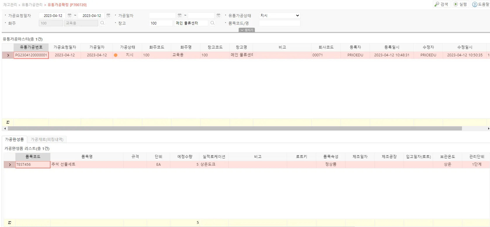 지시 상태의 유통가공 내역을 확정할 수 있으며, 확정 후 재고가 변경됩니다.