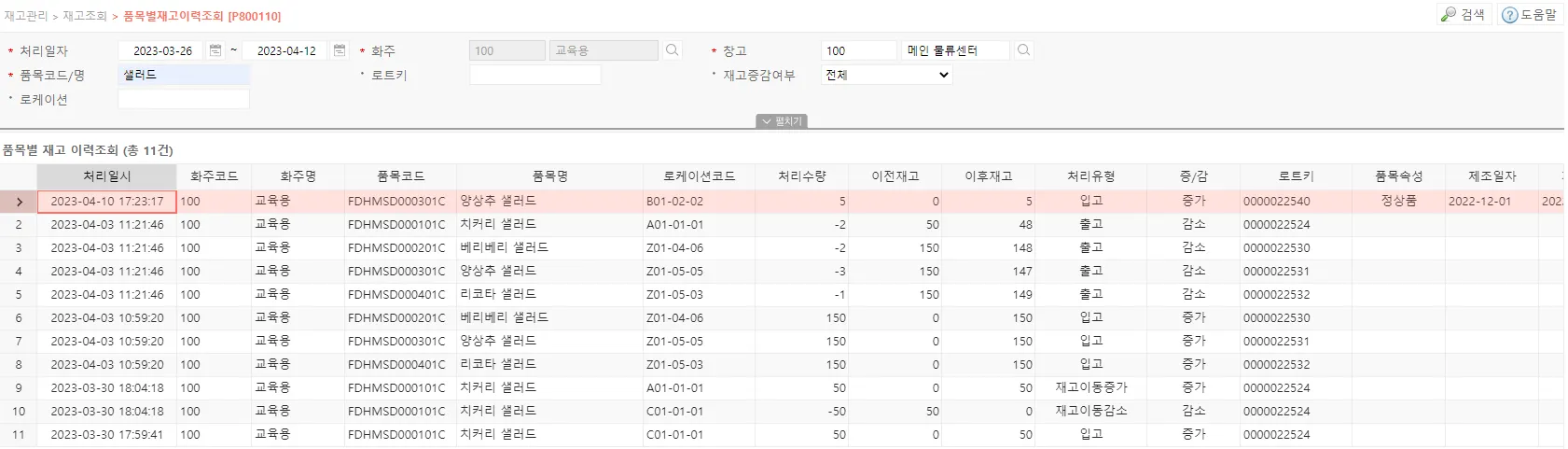 [2] 품목별 재고 이력 조회 (재고관리 > 재고조회 > 품목별재고이력조회)