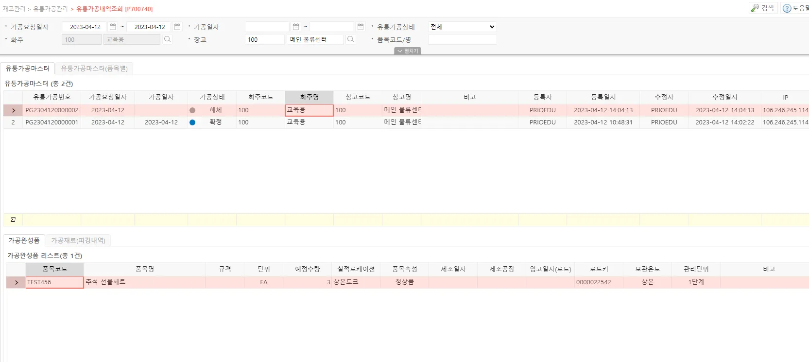 유통가공의 실행과 해체 내역을 조회할 수 있습니다.