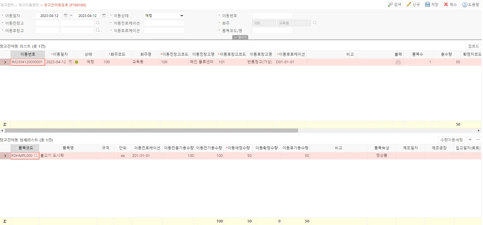 저장 : 신규 창고 간 이동 정보를 입력 후 저장하거나, 저장된 예정 상태의 창고 간 이동 정보를 수정합니다.