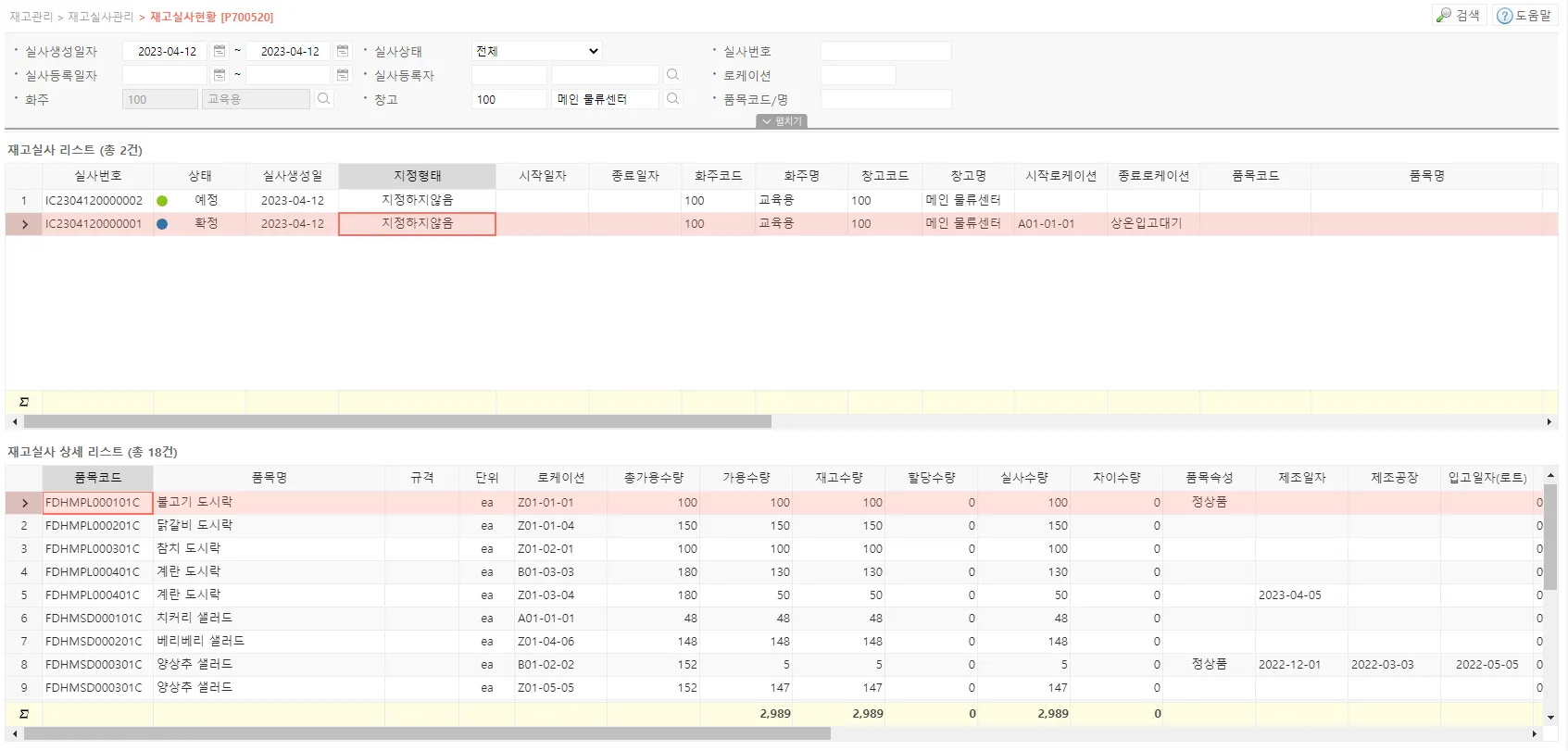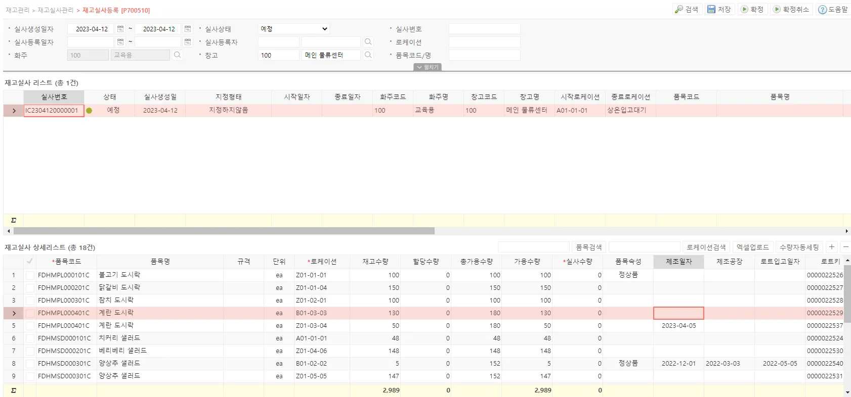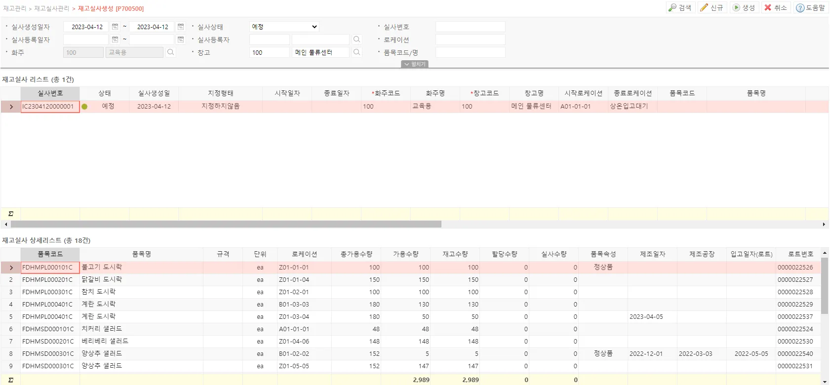 생성 : 신규 상태의 실사 정보를 마스터 그리드에 입력한 조건에 맞게 생성합니다. 생성된 품목 리스트는 재고 실사 상세 리스트에 조회됩니다.