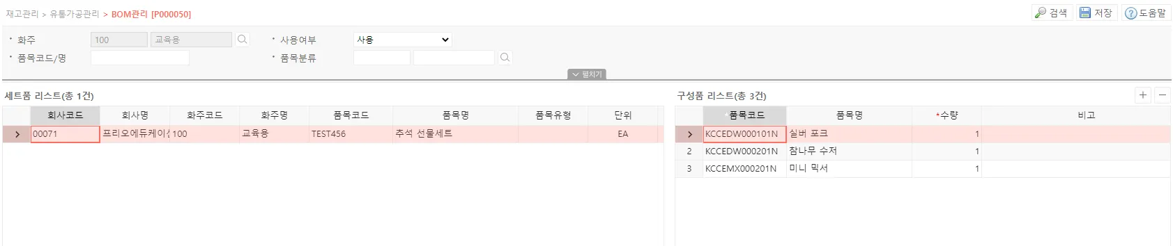 BOM 상품을 선택하고 우측 구성품 리스트 그리드에서 해당 상품의 구성품을 선택합니다.