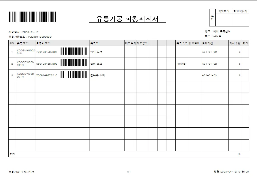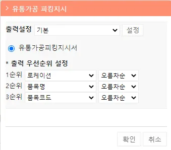설정 후 확인을 누르면 피킹 지시서가 화면에 출력됩니다.