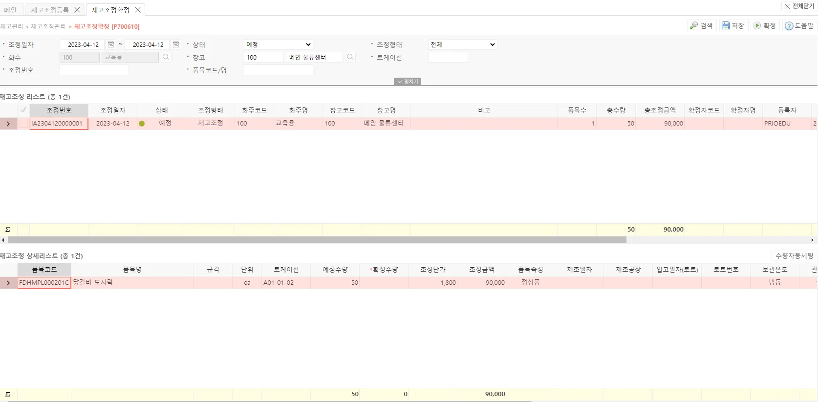 [재고관리 > 재고조정관리 > 재고조정확정]에서 확정할 조정내역을 선택합니다.