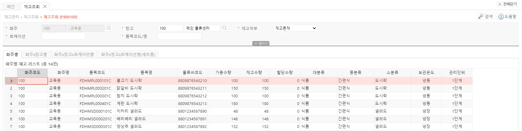 화주x창고별 : 화주별/창고별 품목에 대한 재고를 조회합니다