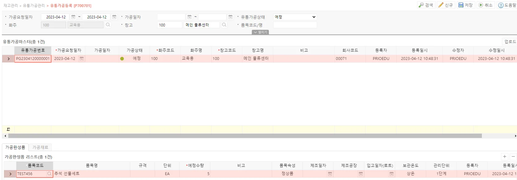[재고관리 > 유통가공관리 > 유통가공등록]