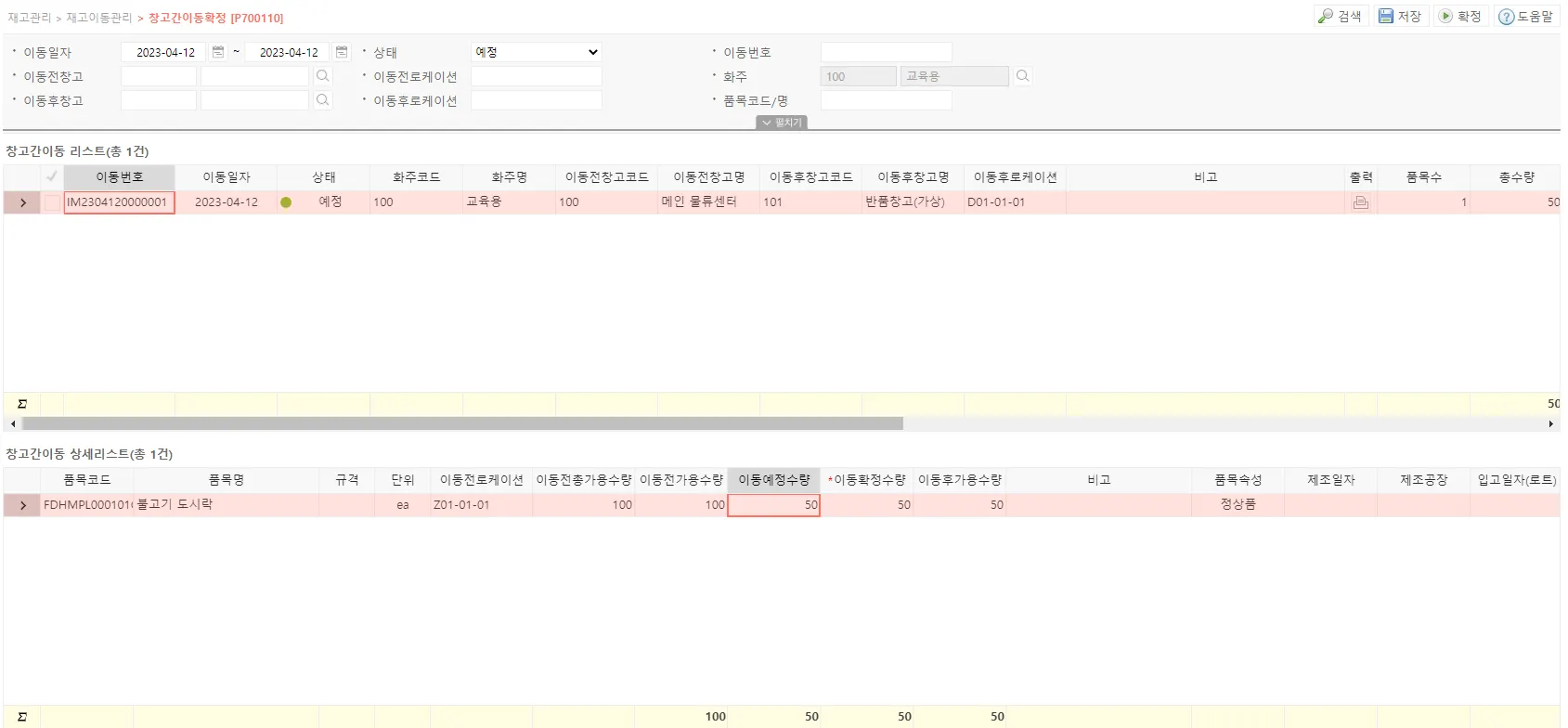 확정 : 예정 상태의 창고 간 이동 정보를 체크하여 확정합니다.