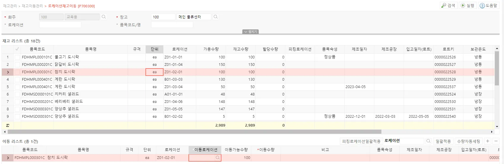 실행 : 디테일 그리드에 있는 품목의 이동을 실행합니다. 로케이션에서 이동 로케이션으로 재고가 이동됩니다.