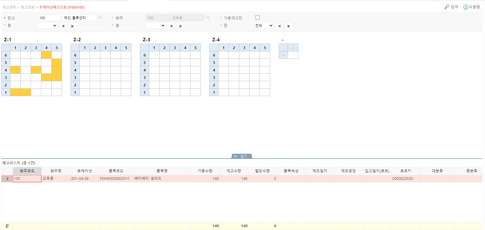 로케이션 재고 조회는 2차원 이미지를 통해 로케이션의 사용 여부와 해당 셀의 재고 리스트를 확인할 수 있는 기능입니다.