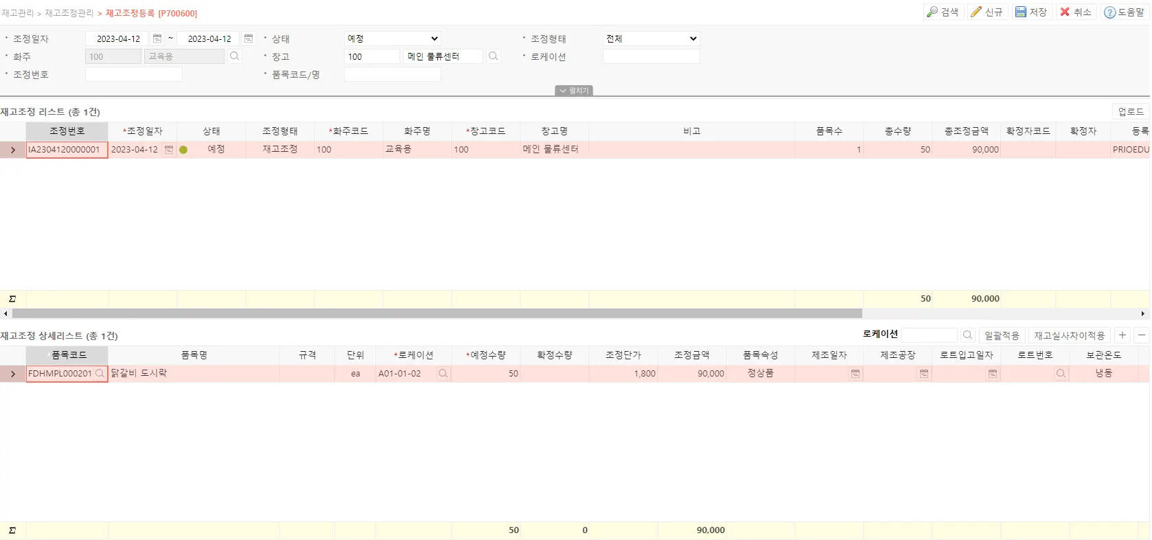 [재고관리 > 재고조정관리 > 재고조정등록]