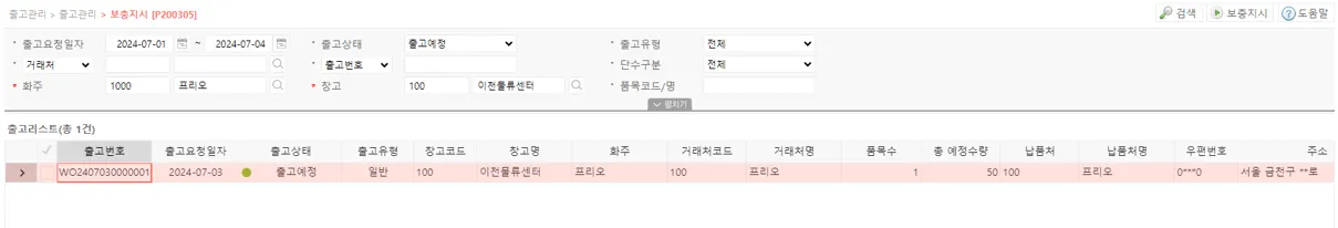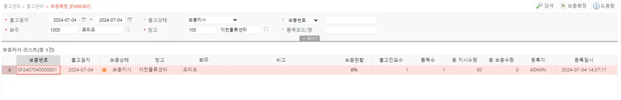 이후 보충 완료된 지시 건은 [ 출고관리 > 출고관리 > 보충확정] 에서 보충완료 처리 할 수 있습니다.