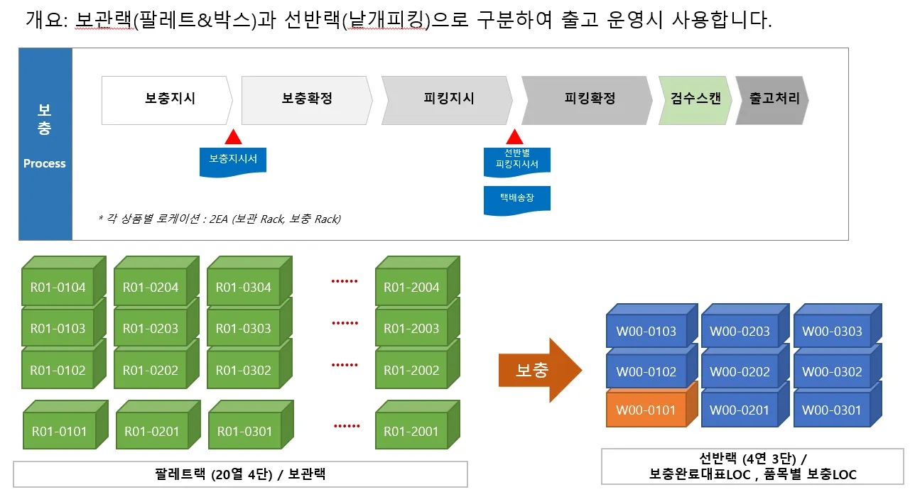 피킹방법(합포/단포)에 따라 보관랙 재고를 선반랙 or 보충랙으로 상품별 총량 보충지시를 생성하는 기능입니다.