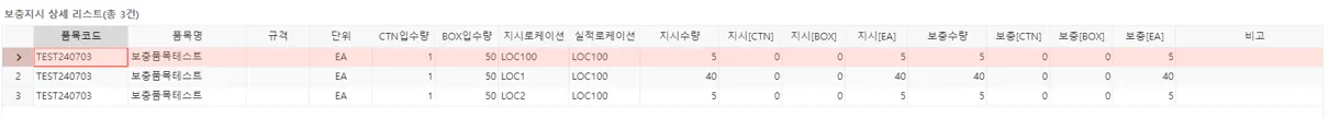 보충지시 : 출고전표를 다중 선택하여 보충 지시를 실행하면 상품별 총량 보충지시 데이터가 생성됩니다.