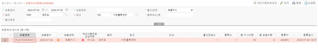 [2] 보충지시서 발행 (출고관리 > 출고관리 > 보충지시서 발행)