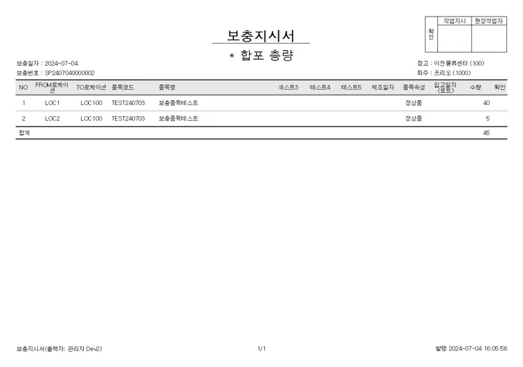 보충을 진행할 내역 선택 후 발행을 누르면 출력 팝업이 생성됩니다.