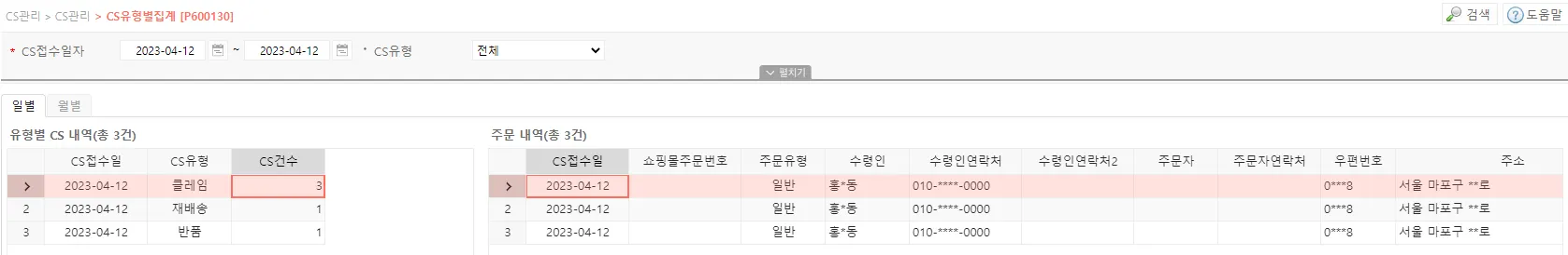 CS 유형별 집계는 기간과 유형별 건수, 상세 내역을 조회할 수 있는 기능입니다.