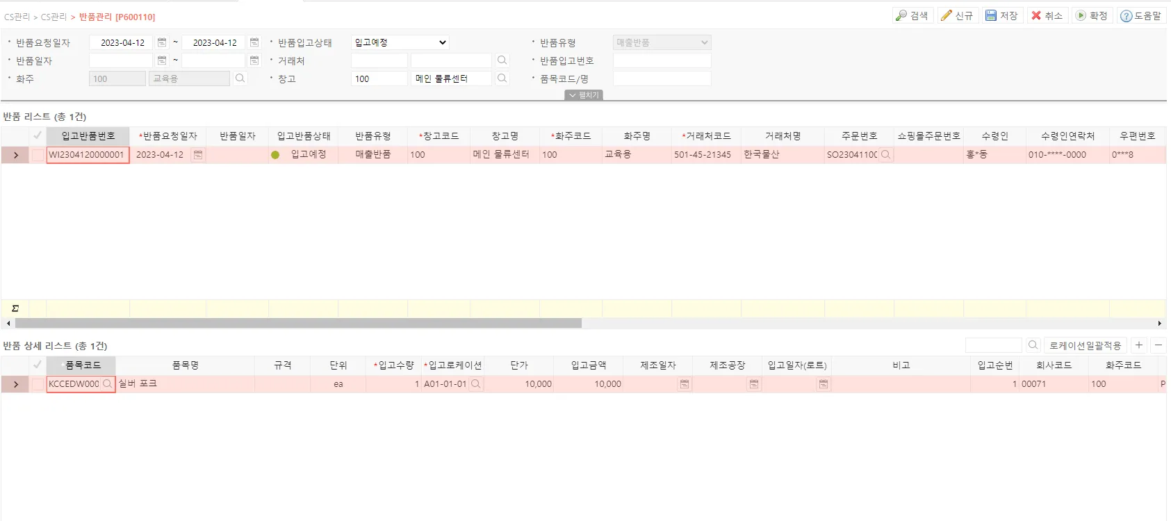 반품 요청 일자를 설정한 후 조회 시 상단 그리드에 반품 리스트가 출력됩니다. 처리할 반품 리스트를 선택하면 하단 그리드에 반품 예정 상품 내역이 나오며 해당 상품의 수량과 로케이션을 지정하여 처리할 수 있습니다. 만약 반품 예정 외 상품이 입고될 경우 리스트를 추가하여 추가 입고 내역을 작성할 수 있으며, 반품 예정 상품의 부분 입고 시 상품 리스트의 삭제를 통해 실입고 내역만 등록할 수 있습니다.