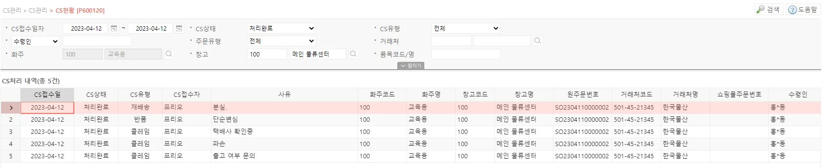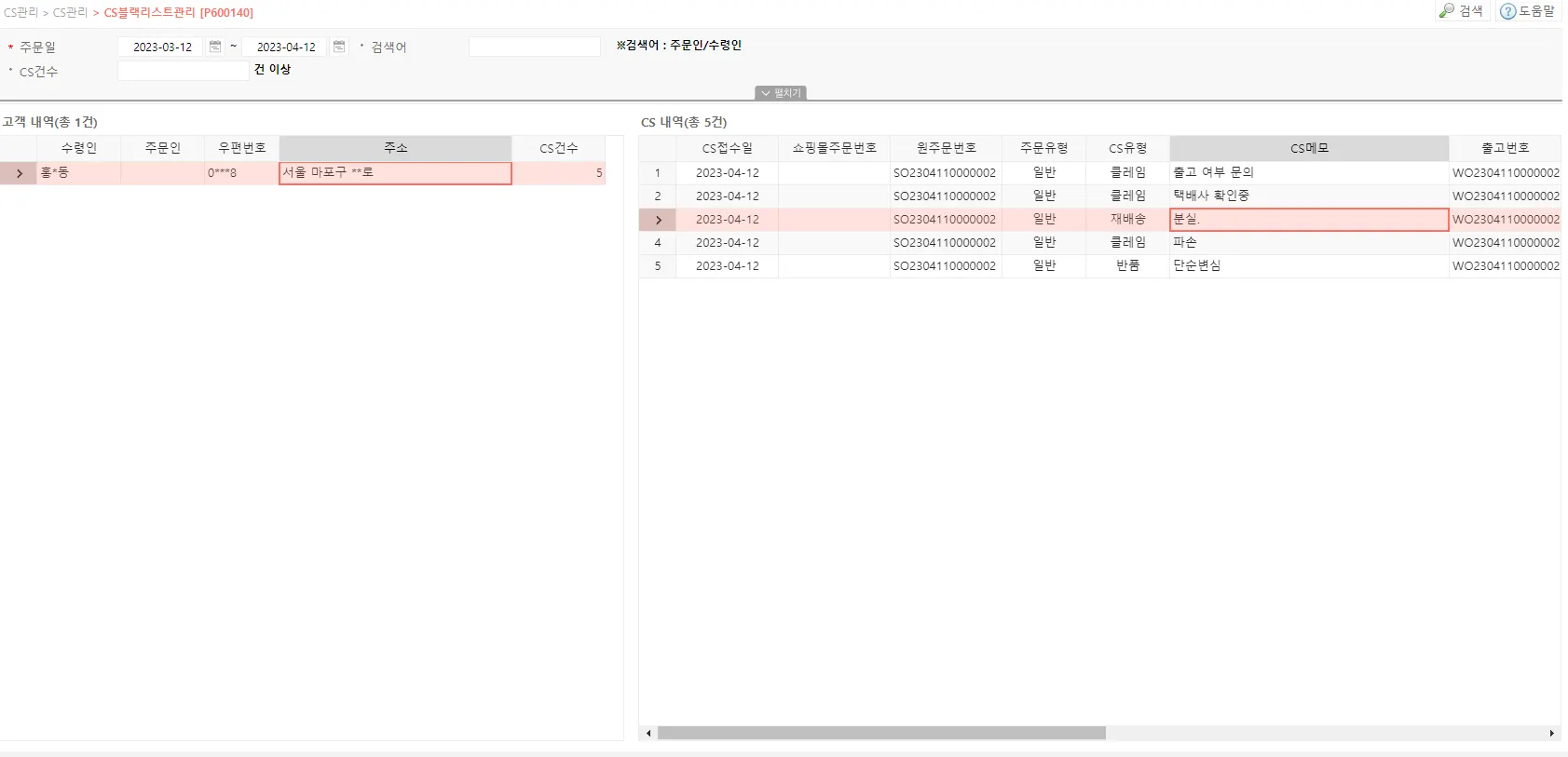 수령인, CS 상태, 유형, 상품등으로 특정 정보만 추출하여 검색 가능합니다.