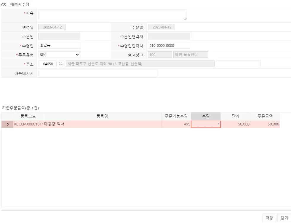 배송지 수정 : 구매자의 배송지 정보를 변경합니다. (출고 지시 이전에만 변경 가능)