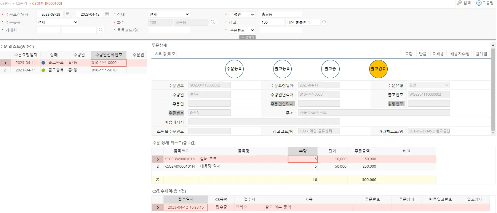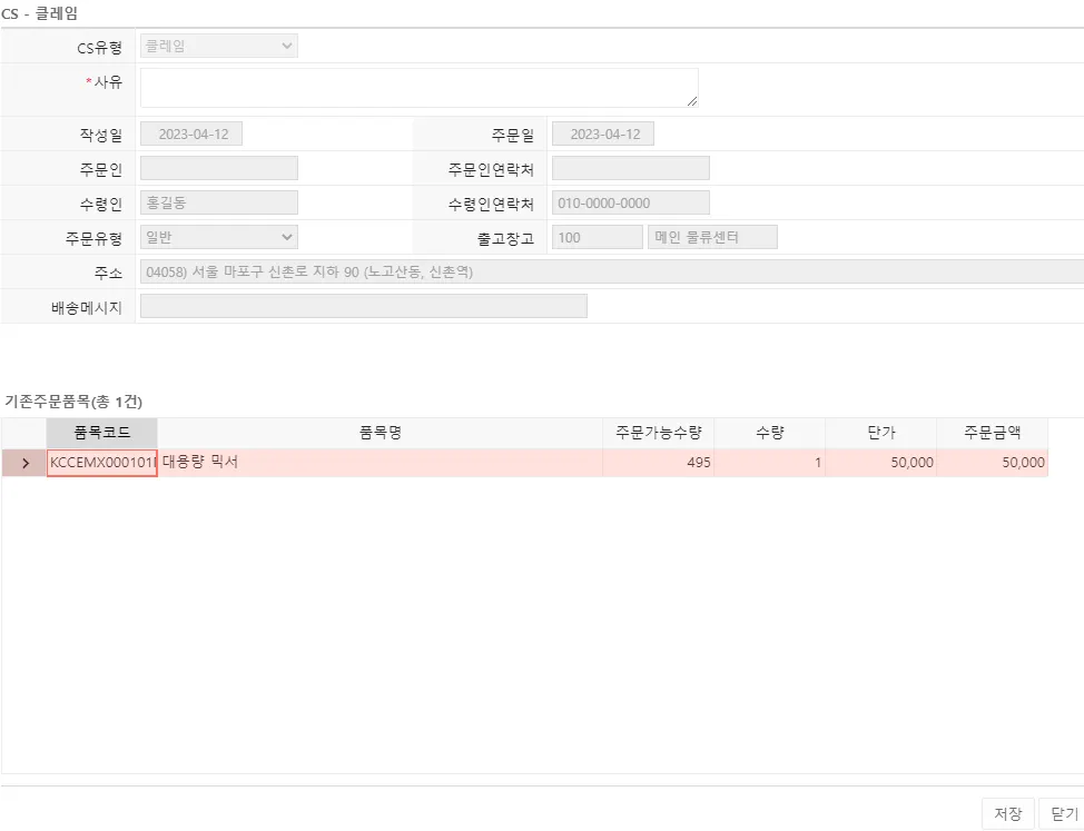 CS 접수 기능은 주문정보의 조회 및 내역 기록을 진행할 수 있는 기능입니다. 주문 처리 상태에 따라 고객의 요청을 주문에 즉시 반영할 수 있습니다.