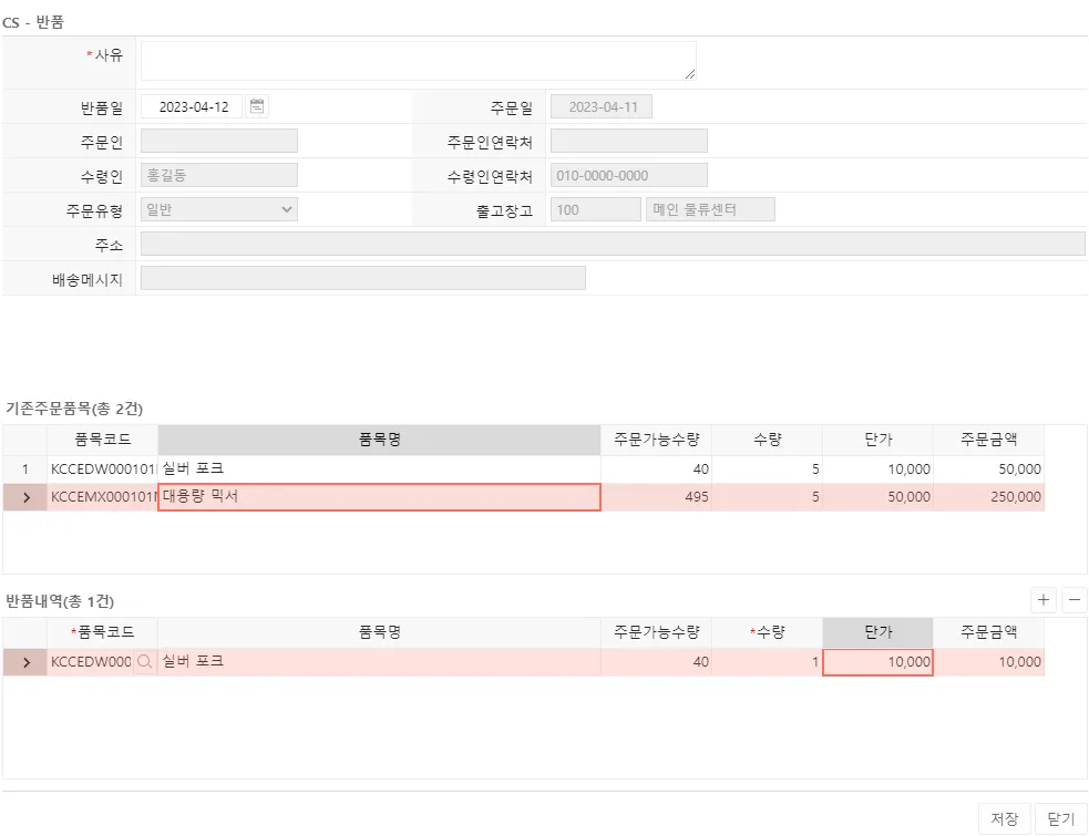 반품 : 상품의 회수를 지시합니다. 입력한 정보가 반품 예정 상품으로 저장됩니다.