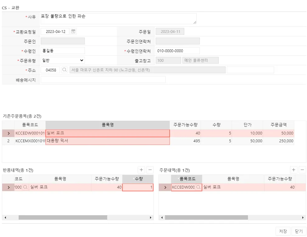 교환 : 반품 상품과 출고 상품을 각각 입력합니다. 수령자의 정보를 변경할 수 있습니다. 반품 상품은 반품 예정에, 출고상품은 출고 예정에 각각 입력됩니다.