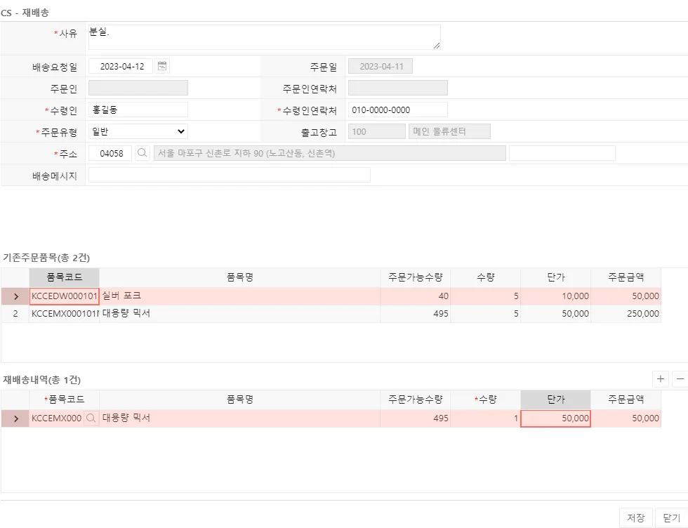 재배송 : 상품의 재출고를 진행합니다. 등록된 내역은 출고 예정에 저장됩니다.