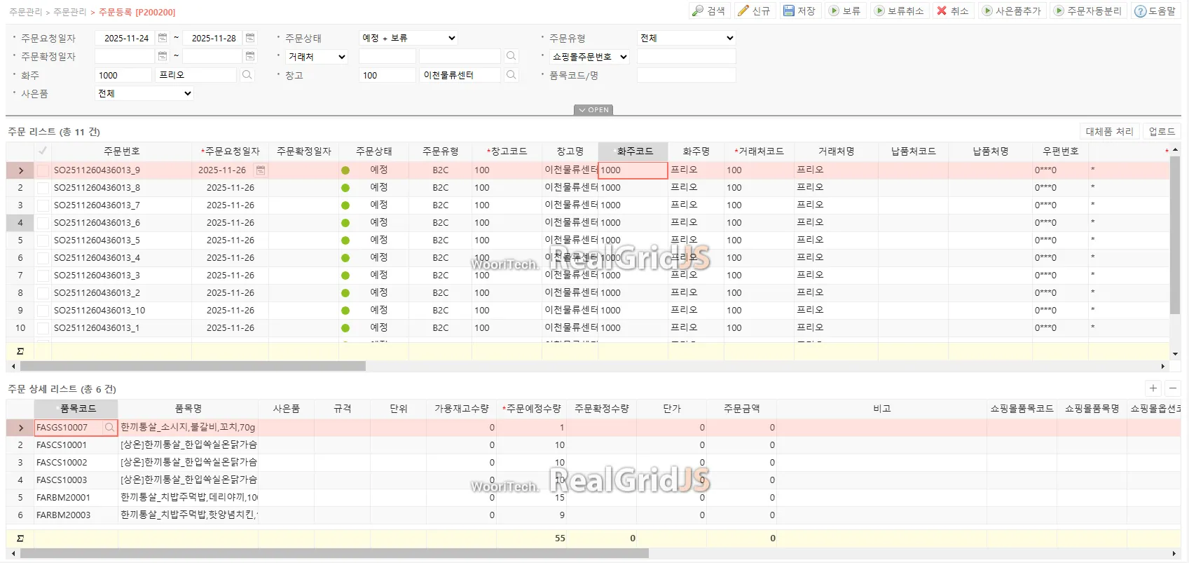 검색 : 선택된 검색 조건으로 검색하여 주문 정보를 조회합니다. 주문 세트품에 경우 단품으로 분리되어 조회됩니다.