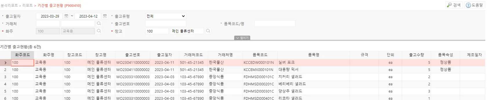 [분석리포트 > 리포트 > 기간별 출고현황] 을 통해 특정 기간 내 고된 상품의 종류와 수량을 검색할 수 있습니다.