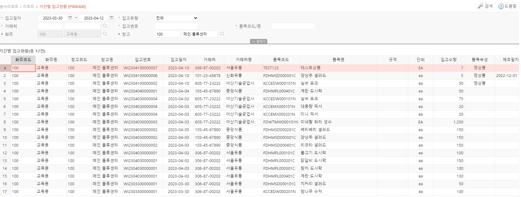 그 외에도 기간별 재고조정, 기간별 로케이션 이동 내역등을 리포트에서 확인할 수 있습니다.