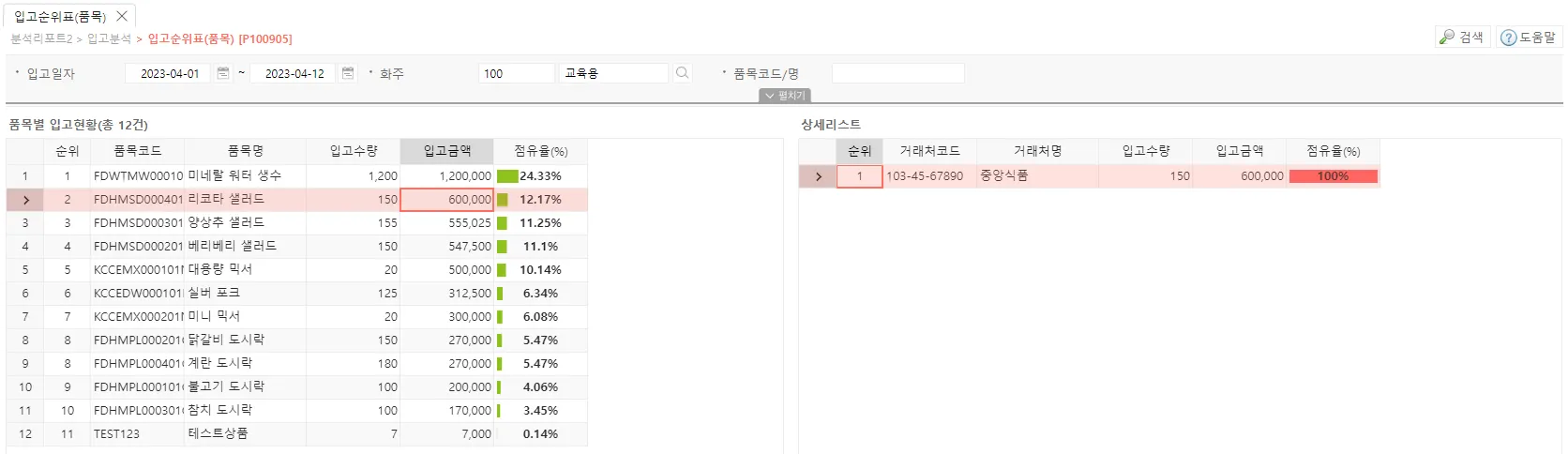 [분석리포트2 > 입고분석 > 매출순위표(품목)]
